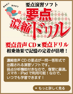 「要点CD」×「要点ドリル」で反復学習! 要点ドリルは、ゲーム感覚で、知識の定着度をチェックできるWEBアプリです。要点CDで聴いて覚えた後に、要点ドリルを使えば、記憶の定着と同時に、自分の弱点把握もできます。このため、苦手な項目だけを、集中的に要点CDに戻って聴きなおすことができ、学習効率を大幅にUPできます。 |
